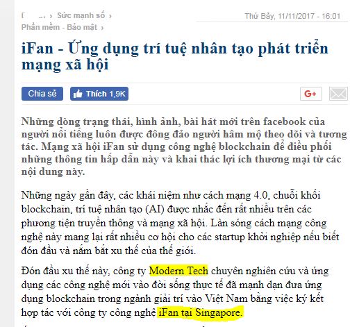 Bài PR đánh bóng tên tuổi của iFan và Modern Tech được đăng tải công khai trên một trang báo (ảnh chụp màn hình).