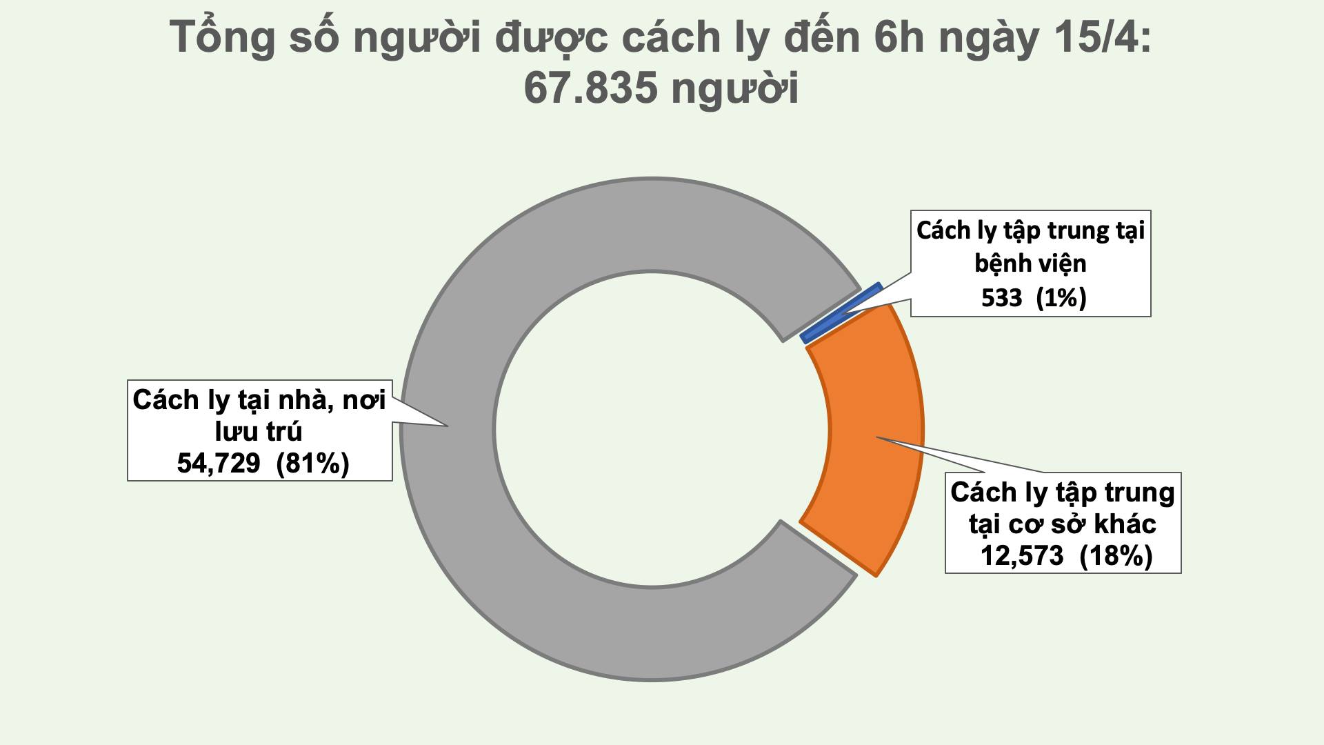 Tổng số người tiếp xúc gần và nhập cảnh từ vùng dịch đang được theo dõi sức khỏe (cách ly): 67.835, trong đó: Cách ly tập trung tại bệnh viện: 533; Cách ly tập trung tại cơ sở khác: 12.573; Cách ly tại nhà, nơi lưu trú: 54.729.