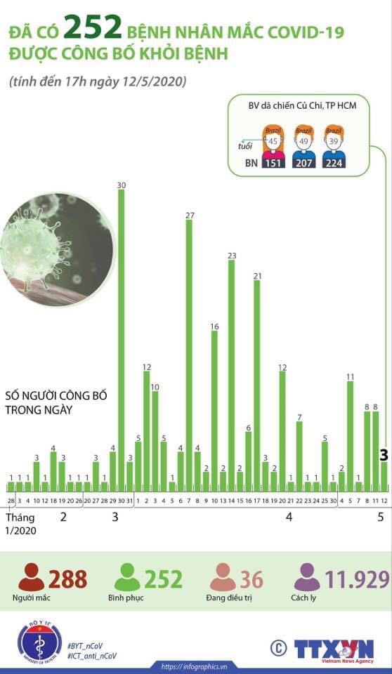 Ngày 12/5, thông tin từ tiểu Ban điều trị - Ban Chỉ đạo Quốc gia phòng, chống dịch COVID-19 cho biết, có 03 bệnh nhân mắc COVID-19 tại bệnh viện Dã chiến Củ Chi (thành phố Hồ Chí Minh) được công bố khỏi bệnh. Cả 03 bệnh nhân này đều là những bệnh nhân dương tính lại sau khi đã được công bố khỏi bệnh trước đó, cụ thể: