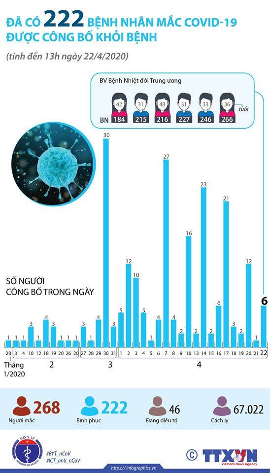 Ngày 22/4/20202, thông tin từ tiểu Ban điều trị - Ban Chỉ đạo Quốc gia phòng, chống dịch COVID-19 cho biết, đã có 06 bệnh nhân mắc COVID-19 tại bệnh viện Bệnh Nhiệt đới Trung ương được công bố khỏi bệnh. Như vậy, đến nay cả nước đã có tổng cộng 222 bệnh nhân mắc COVID-19 được công bố khỏi bệnh, cụ thể: