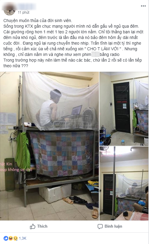 Tài khoản N.K chia sẻ: “Chuyện muôn thuở của đời sinh viên. Sống trong ký túc xá gần chục mạng người, nó (bạn cùng phòng - PV) vẫn dẫn gấu về ngủ qua đêm. Cái giường rộng hơn 1m một tẹo 2 người lớn nằm.