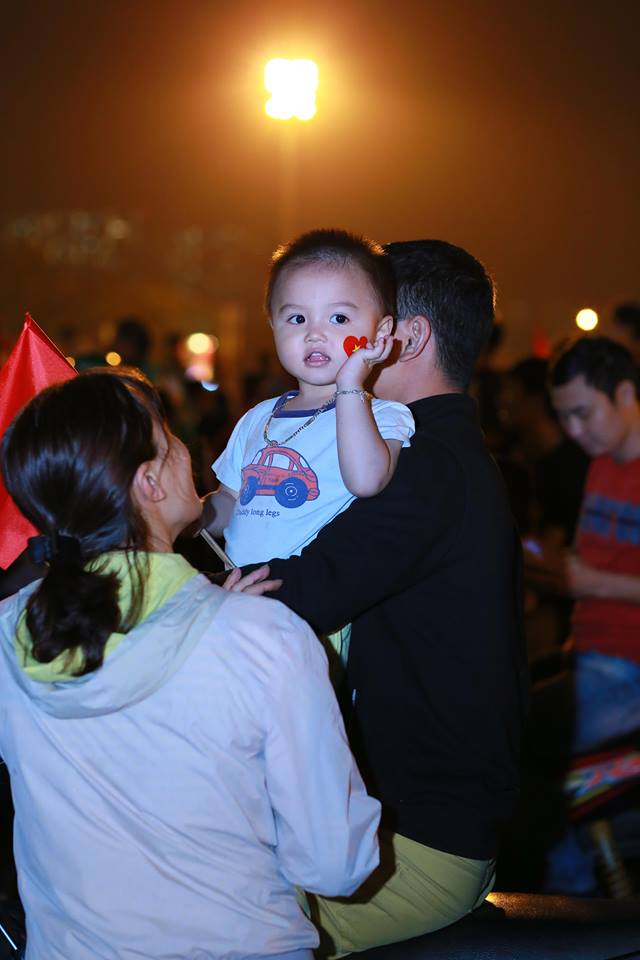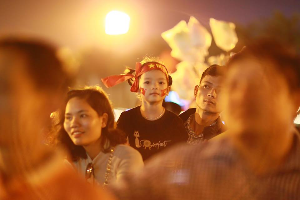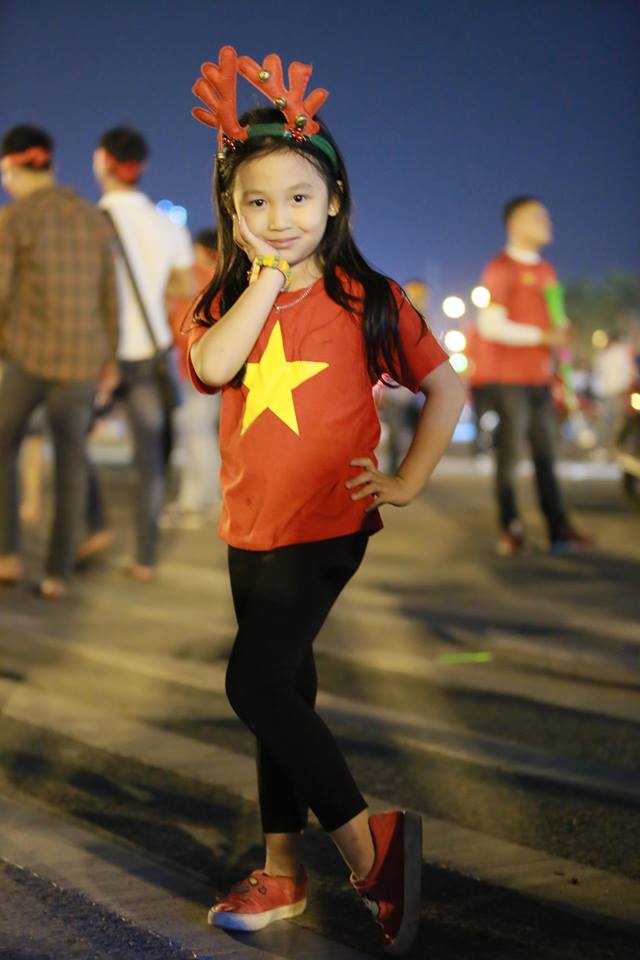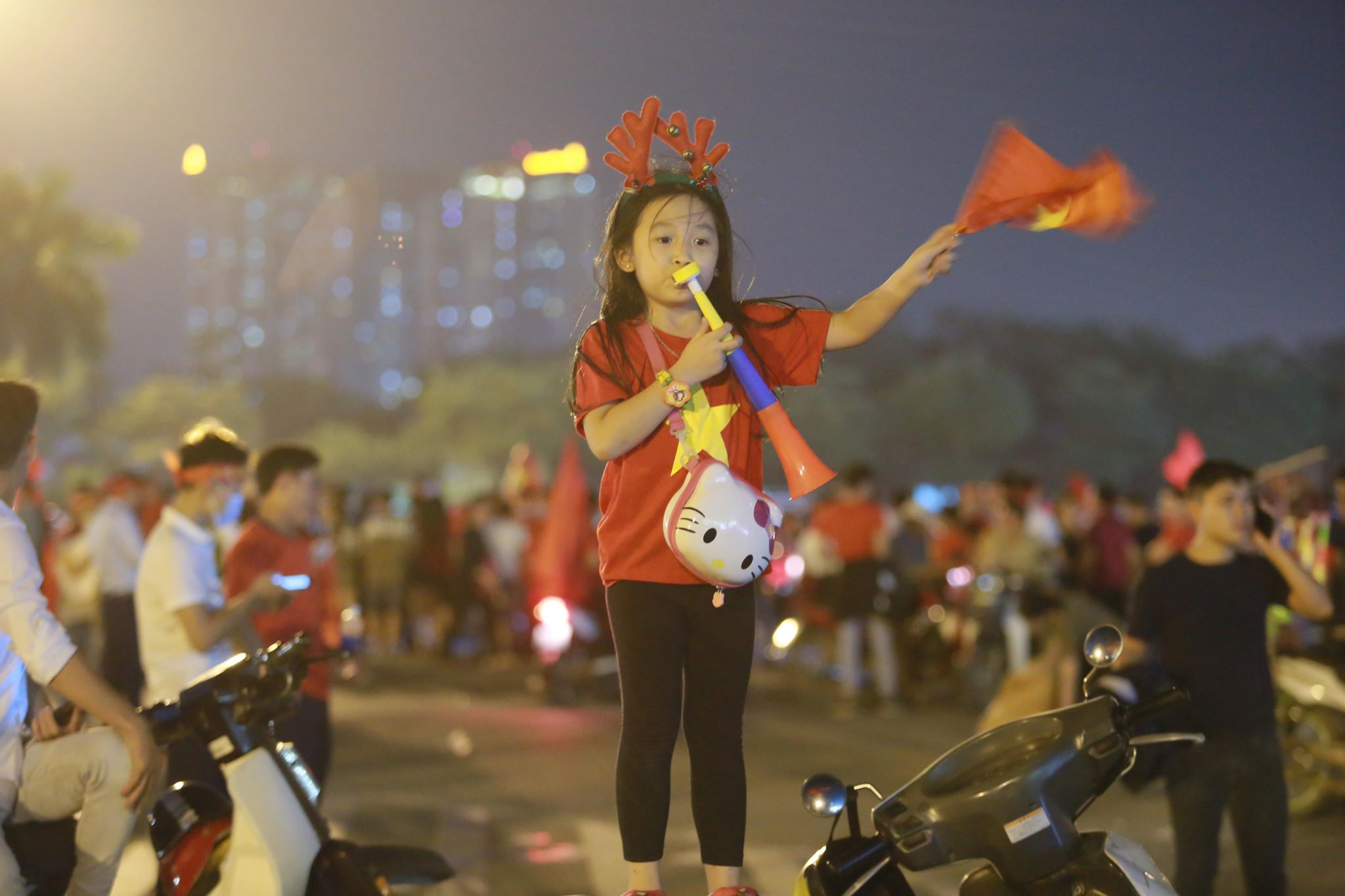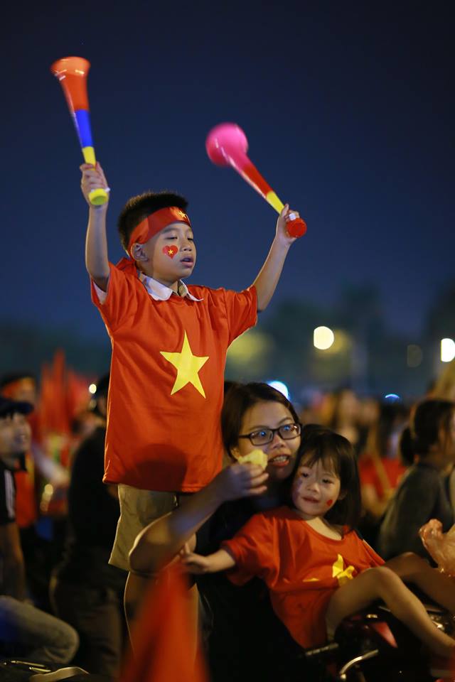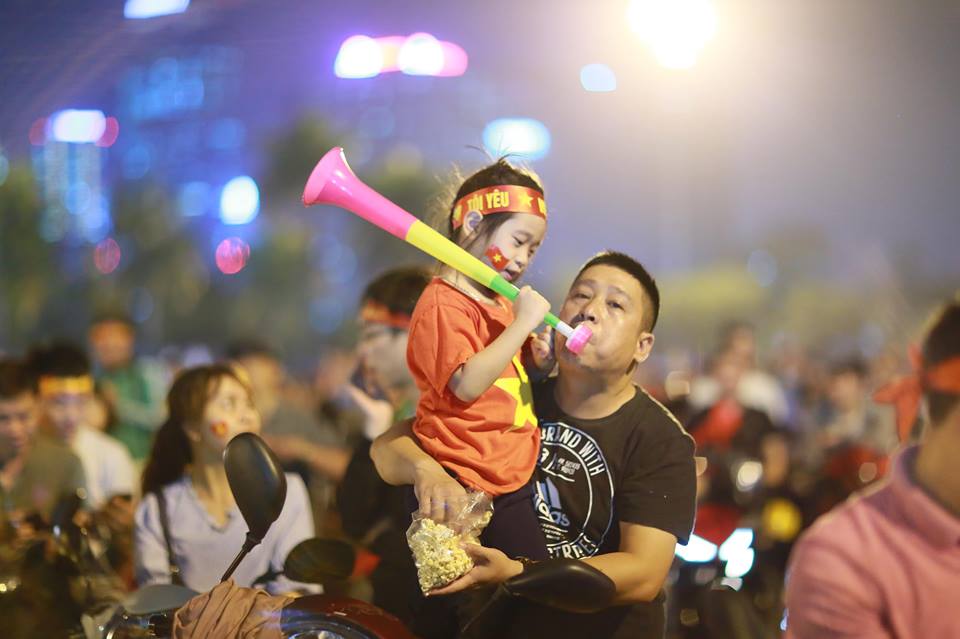 Giữa hàng ngàn CĐV, các em nhỏ luôn thu hút sự quan tâm của nhiều người. Trong ảnh là một bé gái đang cố hết sức thổi kèn thật to cổ vũ siêu nhiệt tình cho đội tuyển Việt Nam.