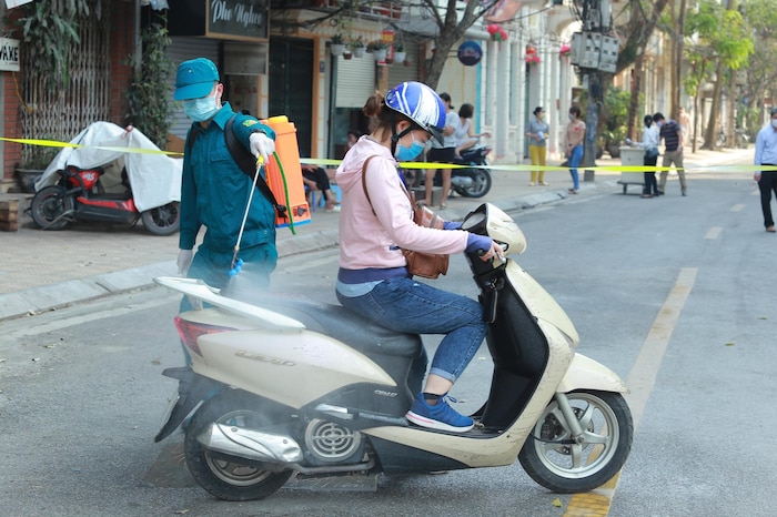 Lực lượng chức năng phun thuốc sát trùng người ra vào phố Trúc Bạch (Hà Nội).