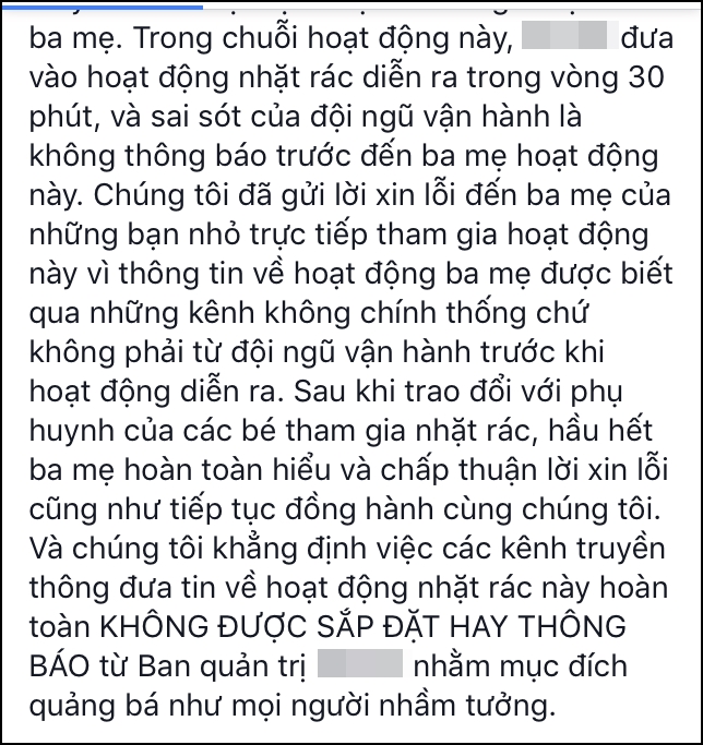 “Chúng tôi đưa vào hoạt động nhặt rác diễn ra trong vòng 30 phút, và sai sót của đội ngũ vận hành là không thông báo trước đến ba mẹ hoạt động này. Chúng tôi đã gửi lời xin lỗi đến ba mẹ của những bạn nhỏ trực tiếp tham gia hoạt động này vì thông tin về hoạt động ba mẹ được biết qua những kênh không chính thống chứ không phải từ đội ngũ vận hành trước khi hoạt động diễn ra. Sau khi trao đổi với phụ huynh của các bé tham gia nhặt rác, hầu hết ba mẹ hoàn toàn hiểu và chấp thuận lời xin lỗi cũng như tiếp tục đồng hành cùng chúng tôi.