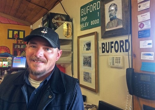 Nhưng Hirsch thực ra không phải là cư dân duy nhất của Buford, mà người đó lại là Brandon Hoover. Ông này được miễn tiền thuê một ngôi nhà nhỏ nằm cách cây xăng vài chục mét. Để đổi lấy chỗ ở và một khoản tiền nhỏ hàng tháng, Hoover chia sẻ trách nhiệm chăm sóc thị trấn và cửa hàng. Còn Hirsch thì lại sống ở một trang trại nhỏ cách khoảng 3 dặm phía Nam Buford.