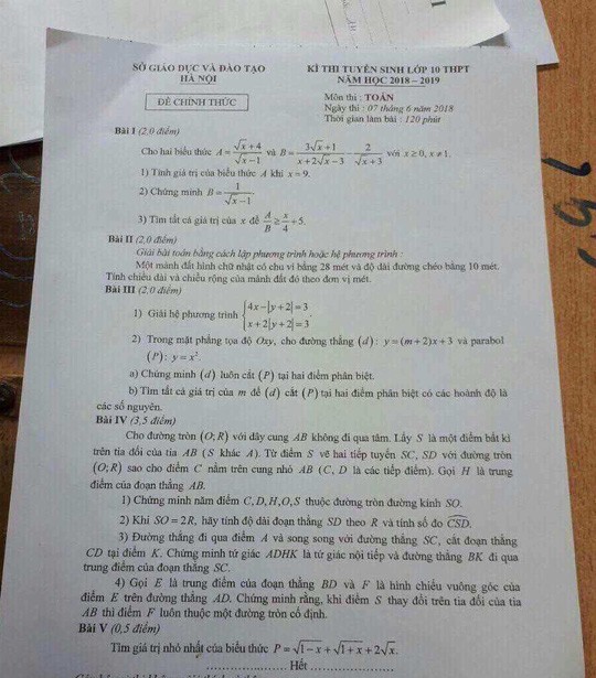 Theo đó, khoảng 15h20 chiều 7/6, khi các thí sinh làm bài chưa đầy 1 tiếng, nhiều phụ huynh đã truyền nhau hình ảnh bản chụp đề thi môn Toán của kỳ thi tuyển sinh lớp 10 năm học 2018-2019.