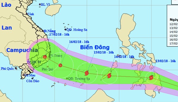Sau đó bão sẽ di chuyển chậm lại theo hướng Tây, đi vào Biển Đông nước ta. Đến 16h ngày 15/2 (30 Tết), vị trí tâm bão cách đảo Trường Sa (thuộc quần đảo Trường Sa) khoảng 340km về phía Đông Đông Bắc, nguy cơ sẽ trở thành cơn bão số 2 của năm 2018.