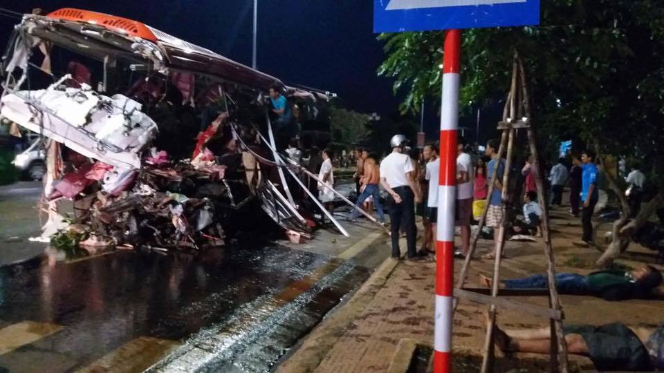 Tại hiện trường vụ tai nạn, xe khách biến dạng hoàn toàn, nhiều người dân đã giúp đỡ đưa các nạn nhân ra ngoài. Thi thể nạn nhân nằm la liệt bên đường.