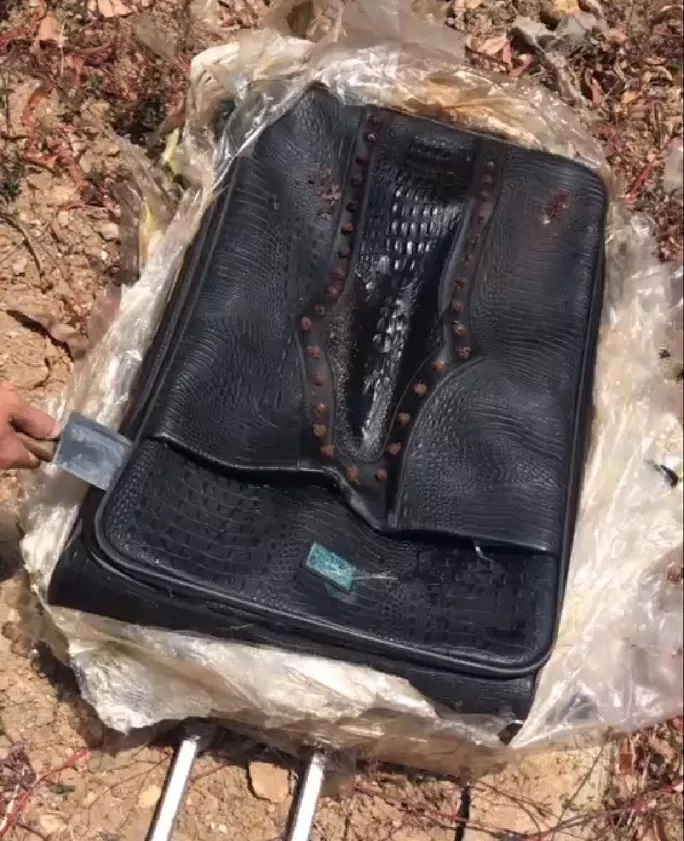 Chiếc vali đựng thi thể được tìm thấy trong bụi rậm. Ảnh: báo Người lao động