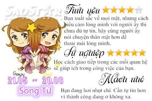 Thứ Bảy 12/9: Song Tử nhụt chí với khó khăn trước mắt 11/09/2015 - 14:41 (GMT+7) Cần tự tin hơn vì thành công đang ở không xa! Chia sẻ Bài viết #Hashtag #SỰ NGHIỆP #TÌNH YÊU #HOROSCOPE #BÓI TOÁN #12 CHÒM SAO