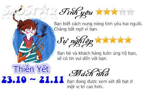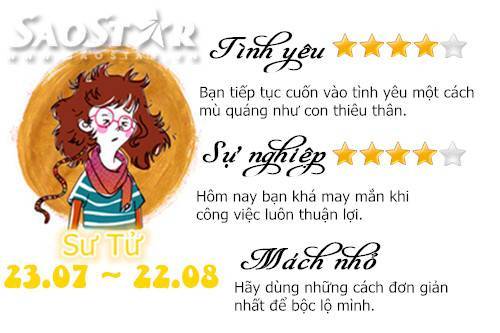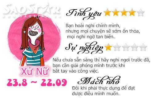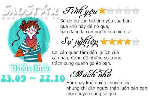 Thứ Bảy 5/9: Sự do dự cản trở tình yêu Thiên Bình 04/09/2015 - 13:20 (GMT+7) Ngày mới sẽ tới và bạn mong biết trước được những điều đang chờ đợi mình phía trước! Chia sẻ Bài viết #Hashtag #CUNG HOÀNG ĐẠO #HOROSCOPE #CHÒM SAO #DAILY #HẰNG NGÀY