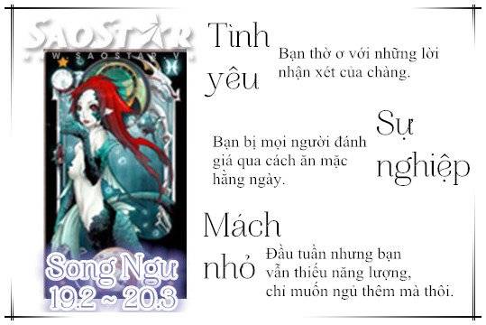 Thứ Hai 5/10: Song Ngư bị đánh giá qua cách ăn mặc 04/10/2015 - 14:00 (GMT+7) Chăm chút cho vẻ bề ngoài cũng thể hiện sự chuyên nghiệp của bạn. Đừng quá xuề xòa để bị đánh giá không hay. Chia sẻ Bài viết #Hashtag #CUNG HOÀNG ĐẠO #HOROSCOPE #BÓI TOÁN #12 CHÒM SAO #DAILY