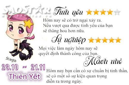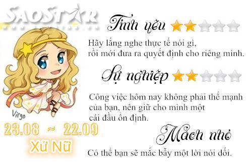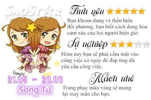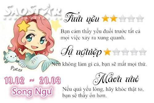 Thứ sáu 11/9: Song Ngư nếu quá yếu lòng, hãy khóc thật to! 10/09/2015 - 13:54 (GMT+7) Học cách trân trọng những gì trước mắt, đừng với quá tầm tay để rồi tuột mất! Chia sẻ Bài viết #Hashtag #SỰ NGHIỆP #CUNG HOÀNG ĐẠO #TÌNH YÊU #HOROSCOPE #BÓI TOÁN