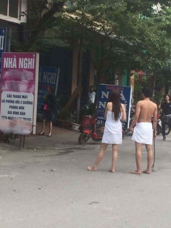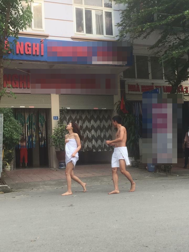 Chàng trai và cô gái chạy ra từ nhà nghỉ, trên người chỉ quấn một chiếc khăn tắm.