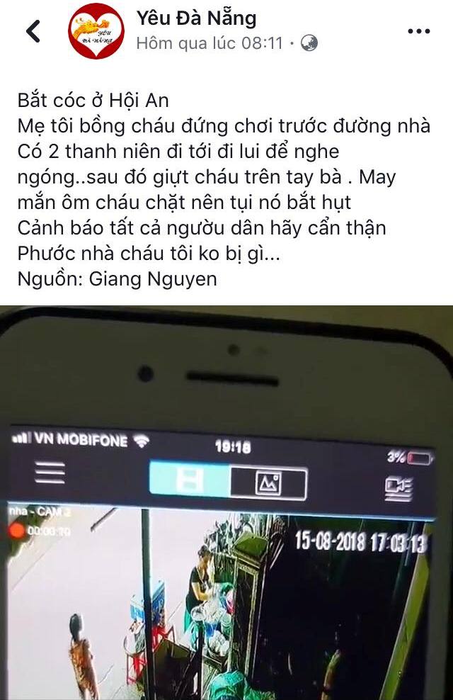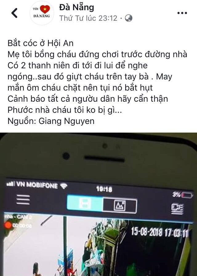Trước đó, tối 15/8, trên trang Facebook cá nhân Giang Nguyen đăng tải đoạn clip kèm status: “Mẹ tôi bồng cháu đứng chơi trước đường nhà. Có 2 thanh niên đi tới đi lui để nghe ngóng sau đó giựt cháu trên tay bà. May mắn ôm cháu chặt nên tụi nó bắt hụt. Cảnh báo tất cả người dân Hội An bọn bắt cóc đã có mặt”.