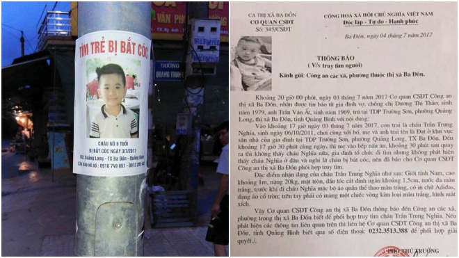 Gia đình anh Ất đi tìm nhưng không thấy cháu Nghĩa. Nghi ngờ con trai bị bắt cóc nên gia đình anh đã trình báo Công an thị xã Ba Đồn. Sau khi tiếp nhận thông tin, Công an thị xã Ba Đồn đã vào cuộc xác minh, ra thông báo tới công an các địa phương phối hợp tìm cháu Nghĩa. Thời điểm cháu bé mất tích, cháu mặc áo phông màu trắng, cổ và tay áo viền đen.