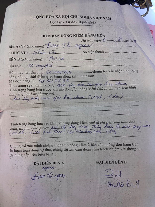 Vị chủ hàng ngay lập tức yêu cầu nhân viên GHN lập biên bản, đồng thời đăng tải hình ảnh vụ việc lên trang Facebook cá nhân làm bằng chứng.