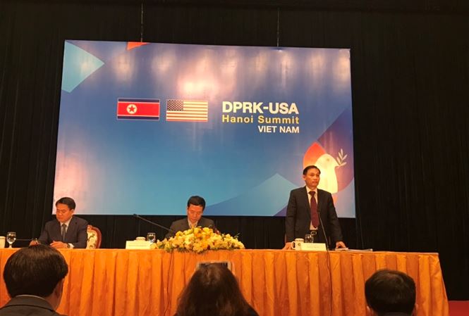 Các quan chức Bộ TTTT, Bộ Ngoại giao và UBND TP Hà Nội tại cuộc họp báo quốc tế sáng 25/2 về thượng đỉnh Mỹ - Triều. (Ảnh: Thu Loan)