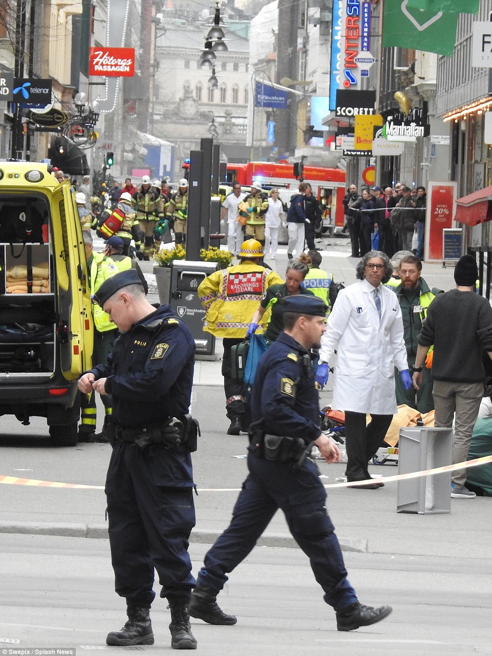 Từ những manh mối ban đầu được thu thập, vẫn chưa thể xác định chính xác đây là một tai nạn thông thường hay khủng bố. Tuy nhiên, theo thủ tướng Thuỵ Điển Stefan Löfven, tất cả mọi bằng chứng hiện tại đều cho thấy vụ việc này có bàn tay khủng bố điều khiển. Được biết chiếc xe tải hạng nặng đã bị đánh cắp trước đó và được sử dụng để lao thẳng vào đám đông qua lại tại khu vực trung tâm thương mại.