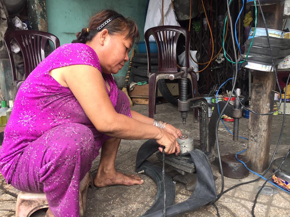 Cô Đỗ Kim Hoàng đang vá xe cho khách.