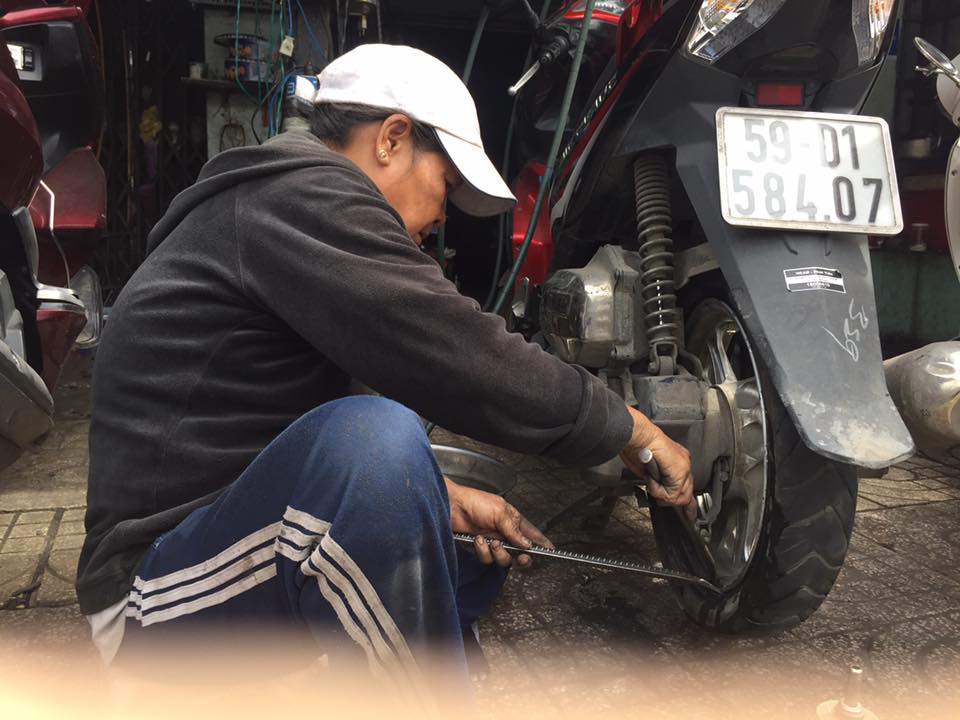 Tìm đến tiệm sửa xe không tên trên đường Âu Cơ, quận Tân Bình, TP. HCM - nơi 8 người phụ nữ đã 50 năm gắn liền với nghề sửa xe máy vốn là nghề của những người đàn ông sức vóc, tôi gặp cô Đỗ Kim Hoàng (53 tuổi) và cô Đỗ Kim Hoa (62 tuổi) đang miệt mài vặn ốc, tháo lốp sửa xe cho khách.