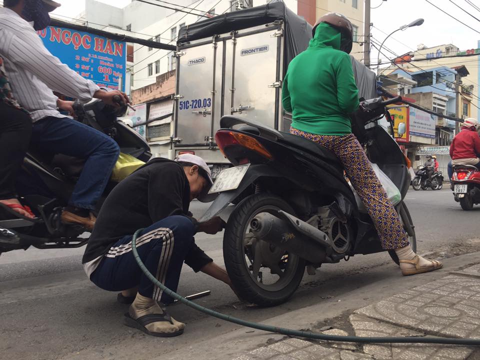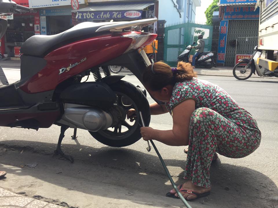 Nhiều lần chú đến bơm xe, vì là khách quen nên mấy cô cũng không lấy tiền. “Tôi là khách hàng quen thuộc của tiệm cô Hoàng nhiều năm nay rồi, ở đây sửa xe thì yên tâm cả về chất lượng lẫn giá cả”, chú Hùng cười nói.