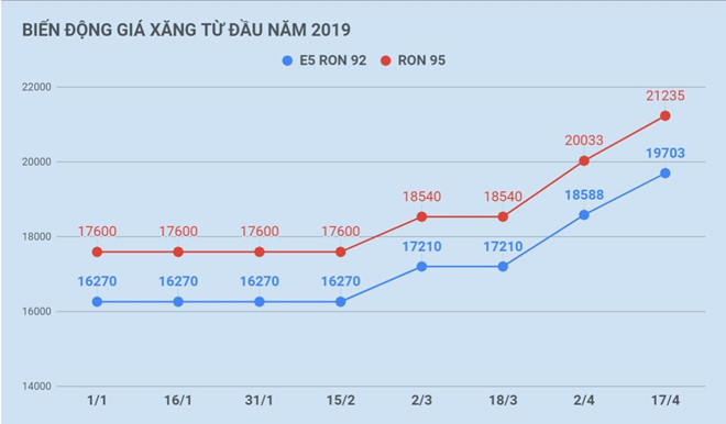 Theo liên Bộ Công Thương - Tài chính, trung bình giá xăng dầu thế giới trong 15 ngày trước 17/4 là 77,9 USD/thùng xăng RON 92 dùng để pha chế xăng E5 RON 92 (tăng 3 USD/thùng); 79,8 USD/thùng xăng RON 95 (tăng 3,4 USD/thùng), 82 USD/thùng dầu diesel 0.05S (tăng 1,9 USD/thùng); 81,7 USD/thùng dầu hỏa (tăng 1,9 USD/thùng). Giá etanol E100 dùng để pha chế xăng E5 RON 92 là 14.725 đồng/lít (chưa có thuế VAT).