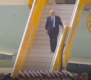 Điều bất ngờ nhất là khi cửa cabin mở ra, Tổng thống Donald Trump xuất hiện và rời chuyên cơ trên xe thang không có thảm đỏ. Chưa hết, khi di chuyển xuống mặt đất ông Donald Trump không bước ở chính giữa cầu thang như thông thường, mà đi sát vào thành trái của chiếc xe thang.