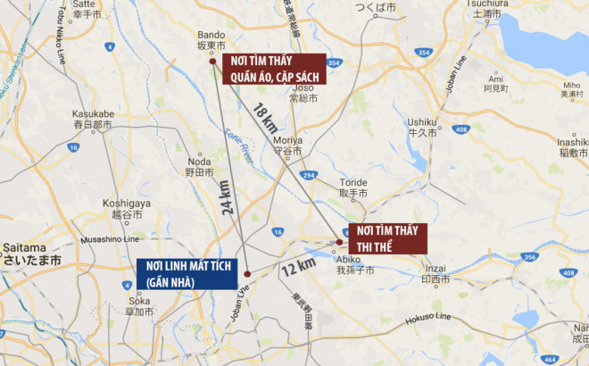 Nghi phạm Shibuya sở hữu 2 chiếc xe, được camera an ninh ghi lại đã nhiều lần di chuyển quanh nơi tìm thấy quần áo, cặp sách và nơi tìm thấy thi thể Nhật Linh. Bản đồ: Google Maps.