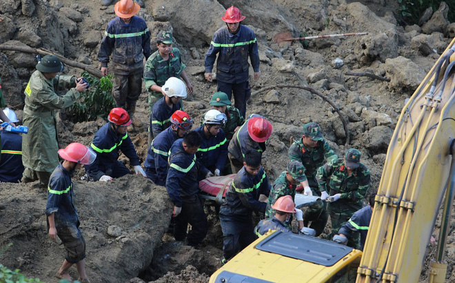 Lực lượng chức năng đưa một nạn nhân trong vụ sạt lở kinh hoàng ra ngoài.