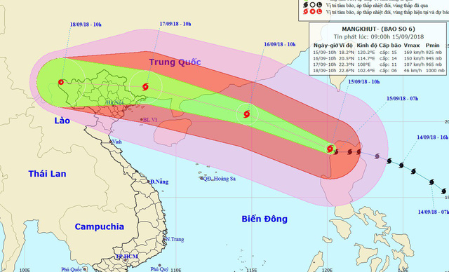 Tin từ Trung tâm Dự báo Khí tượng Thủy văn Trung ương cho hay, hồi 11h hôm nay ngày 15/9, vị trí tâm bão ở trên khu vực Đông Bắc Biển Đông. Sức gió mạnh nhất vùng gần tâm bão mạnh cấp 15 (165-185km/giờ), giật trên cấp 17. Phạm vi gió mạnh cấp 6, giật cấp 8 trở lên khoảng 380km tính từ vùng tâm bão; Phạm vi gió mạnh cấp 10 trở lên khoảng 190km tính từ vùng tâm bão.