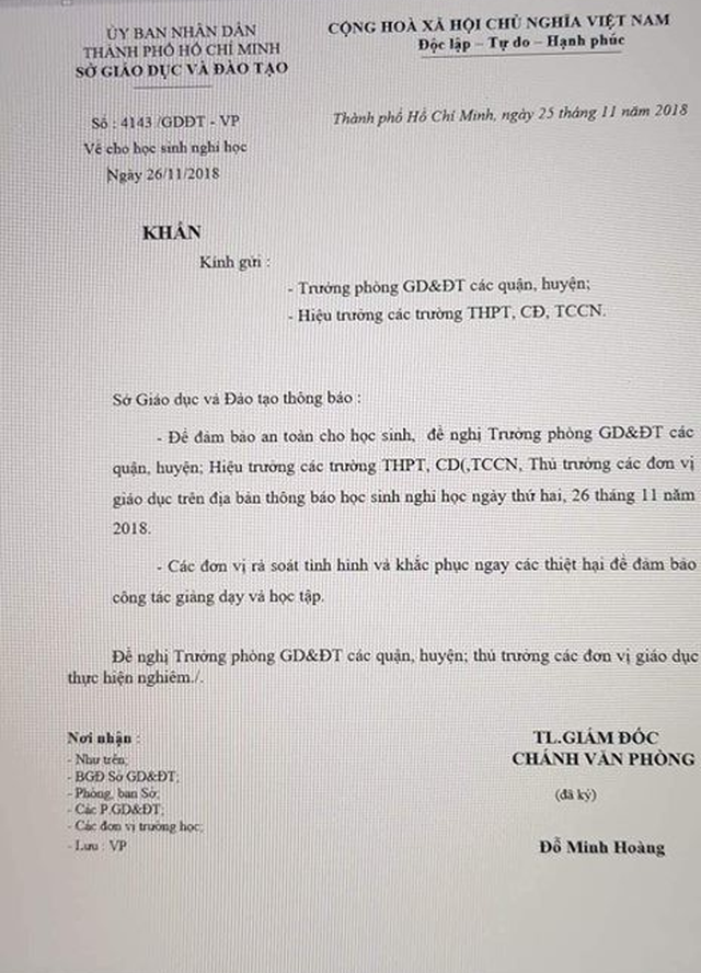 Công văn khẩn của Sở GD -ĐT TP.HCM cho HS toàn thành phố nghỉ học ngày 26/11