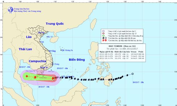 Từ trưa nay (25/12), vùng biển các tỉnh từ Bà Rịa-Vũng Tàu đến Cà Mau (bao gồm cả Côn Đảo) có gió mạnh dần lên cấp 8, sau tăng lên cấp 9, giật cấp 12; sóng biển cao từ 6-8 mét. Khi vào vùng biển Cà Mau - Kiên Giang lúc 10h ngày 26/12, bão có sức gió mạnh nhất 75 km/h (cấp 8).