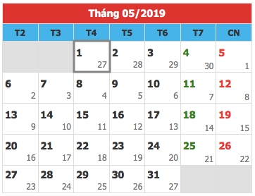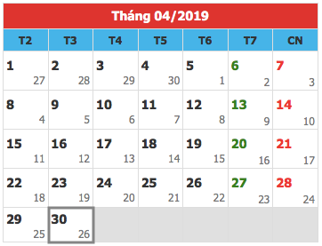 Phương án 2: Nghỉ 5 ngày liên tục từ ngày 27/4/2019 đến hết ngày 1/5/2019 dương lịch. Do ngày thứ Hai là ngày đi làm xen kẽ giữa các ngày nghỉ nên Bộ này đề xuất nghỉ hoán đổi và đi làm bù vào thứ Bảy 4/5/2019 dương lịch.