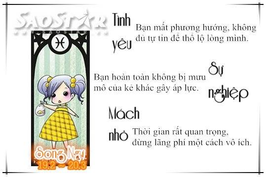 Thứ Bảy 3/10: Tình cảm Song Ngư rối như tơ vò 02/10/2015 - 14:00 (GMT+7) Một chút mới mẻ trong cuộc sống sẽ giúp bạn tự tin nắm chặt trái tim chàng hơn. Chia sẻ Bài viết #Hashtag #SỰ NGHIỆP #CUNG HOÀNG ĐẠO #TÌNH YÊU #HOROSCOPE #BÓI TOÁN