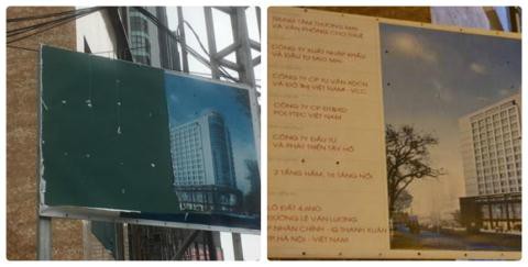 Tấm biển trước dự án Trung tâm thương mại và Văn phòng cho thuê (đường Lê Văn Lương, P. Nhân Chính, Q. Thanh Xuân, TP. Hà Nội) sau và trước khi xảy ra vụ tai nạn lao động. Ảnh: ĐVO