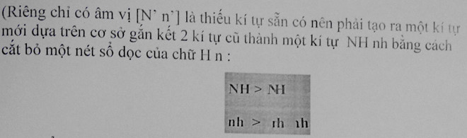 Riêng chỉ có âm vị [N’ n’] là thiếu ký tự sẵn có nên phải tạo ra một cái mới dựa trên cơ sở gắn kết 2 ký tự cũ thành một ký tự NH nh bằng cách cắt bỏ một nét sổ dọc của chữ H n: