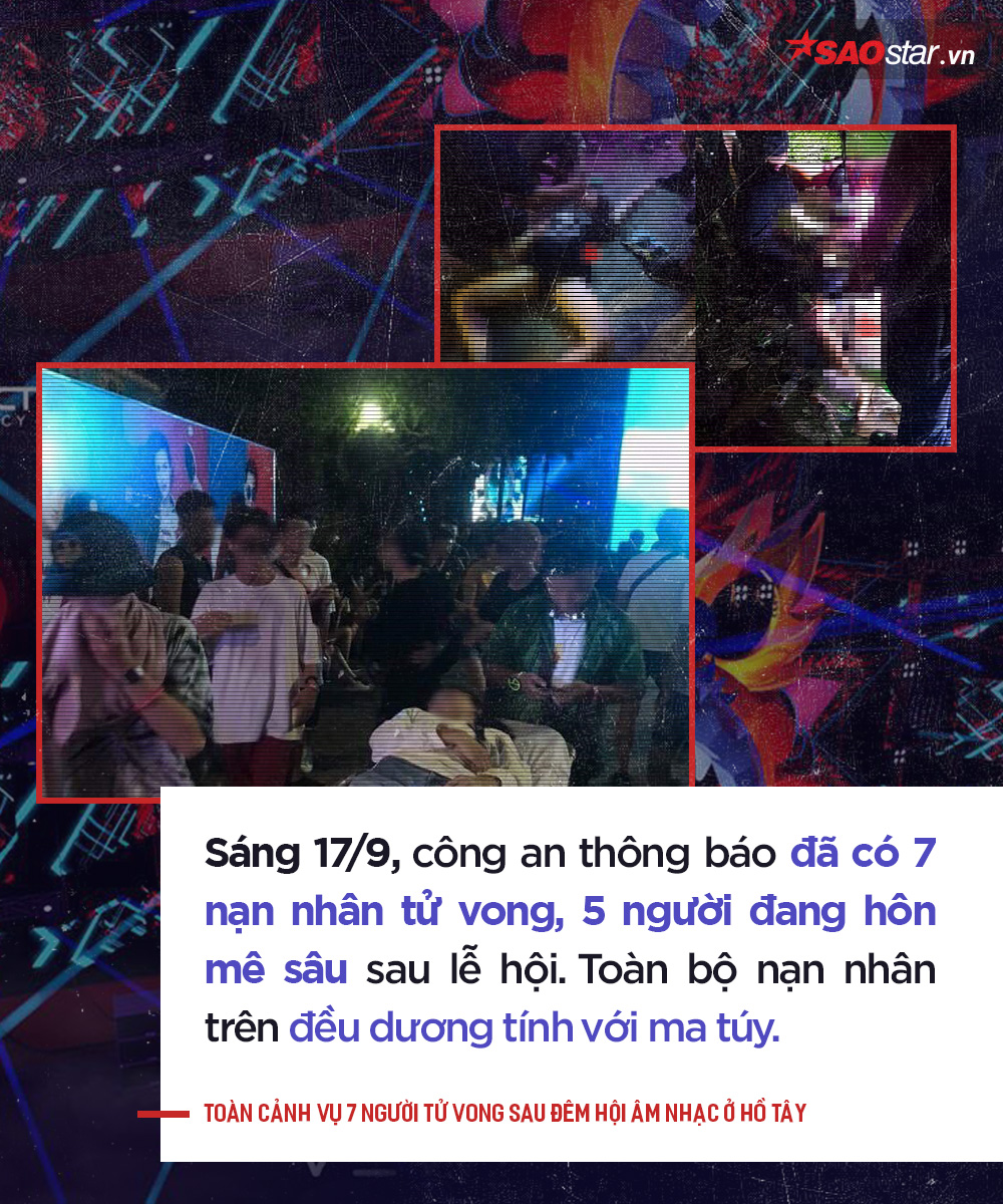 Tính đến trưa 17/9, 7 nạn nhân đã tử vong, 5 người đang hôn mê sâu. Toàn bộ các nạn nhân trên đều dương tính với ma tuý. Khám nghiệm hiện trường, cảnh sát phát hiện có nhiều bóng cười và một số chất nghi là ma túy.
