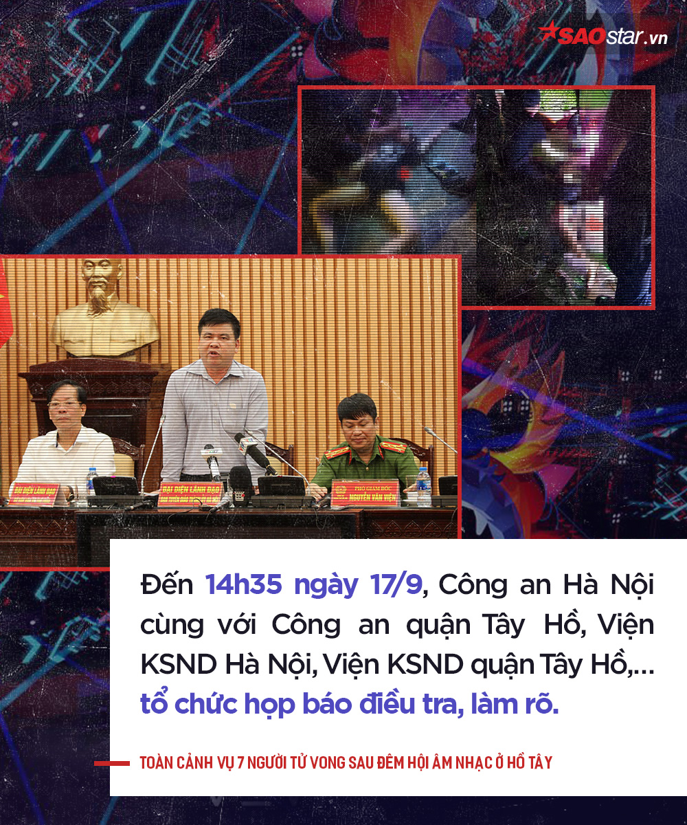 Đến 14h35 ngày 17/9, cơ quan chức năng Hà Nội đã tổ chức cuộc họp báo điều tra làm rõ. Tại cuộc họp báo, Đại tá Nguyễn Văn Viện, Phó Giám đốc Công an TP Hà Nội thông tin hai nam giới đến cấp cứu tại Bệnh viện Tim Hà Nội là Hoàng Việt Hưng (SN 1990, trú tại phường Việt Hưng, quận Long Biên) và Tống Xuân Bình (SN 1989, ở quận Lê Chân, TP Hải Phòng), cả 2 trường hợp này nhập viện trong tình trạng tim ngừng đập các bác sĩ tích cực cứu chữa song 35 phút sau đã tử vong.