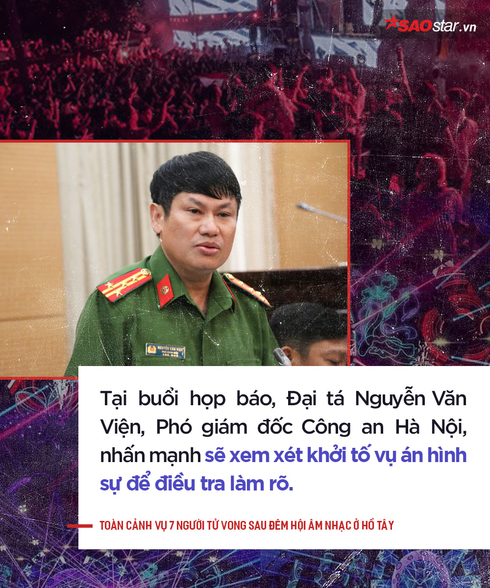 “Phía Sở đã cấp phép cho công ty này tổ chức nhiều sự kiện âm nhạc, các chương trình diễn ra rất tốt, chưa từng vi phạm hành chính. Chương trình biểu diễn âm nhạc điện tử không lời do 4 DJ người nước ngoài biểu diễn. Sở Văn hoá, Thể thao Hà Nội tiếp nhận hồ sơ biểu diễn trong chương trình đại nhạc hội mùa thu diễn ra ngày 16/9 tại Công viên nước hồ Tây. Toàn bộ quy trình tiếp nhận hồ sơ cáp giấy phép theo đúng quy định pháp luật. Trong chương trình xảy ra sự việc đáng tiếc như chúng ta đã biết”, ông Tiến thông tin.