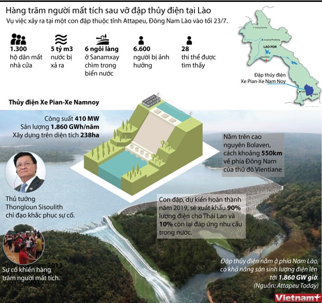 Theo hãng thông tấn Lào LNA đưa tin, đập của công trình thủy điện Xepian-Xe Nam Noy ở tỉnh Attapeu bị vỡ vào 20h ngày 23/7, mang theo hàng tỷ m3 nước nhấn chìm 6 bản của huyện Sanamxay.