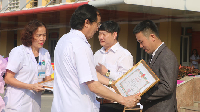 Sáng nay, 2.4, tại Bệnh viện đa khoa Hà Tĩnh, thừa ủy quyền của Bộ trưởng Bộ Y tế, ông Nguyễn Viết Đồng, Giám đốc Bệnh viện đa khoa Hà Tĩnh, đã trao bằng khen của Bộ trưởng cho thầy giáo Nguyễn Quý Hùng (38 tuổi, giáo viên Trường THCS Cao Quảng, xã Cao Quảng, huyện Tuyên Hóa, Quảng Bình) và anh Nguyễn Văn Quân (33 tuổi, cán bộ Văn phòng HĐND và UBND huyện Lệ Thủy, Quảng Bình) vì có thành tích xuất sắc trong công tác hiến máu tự nguyện cứu người bệnh.