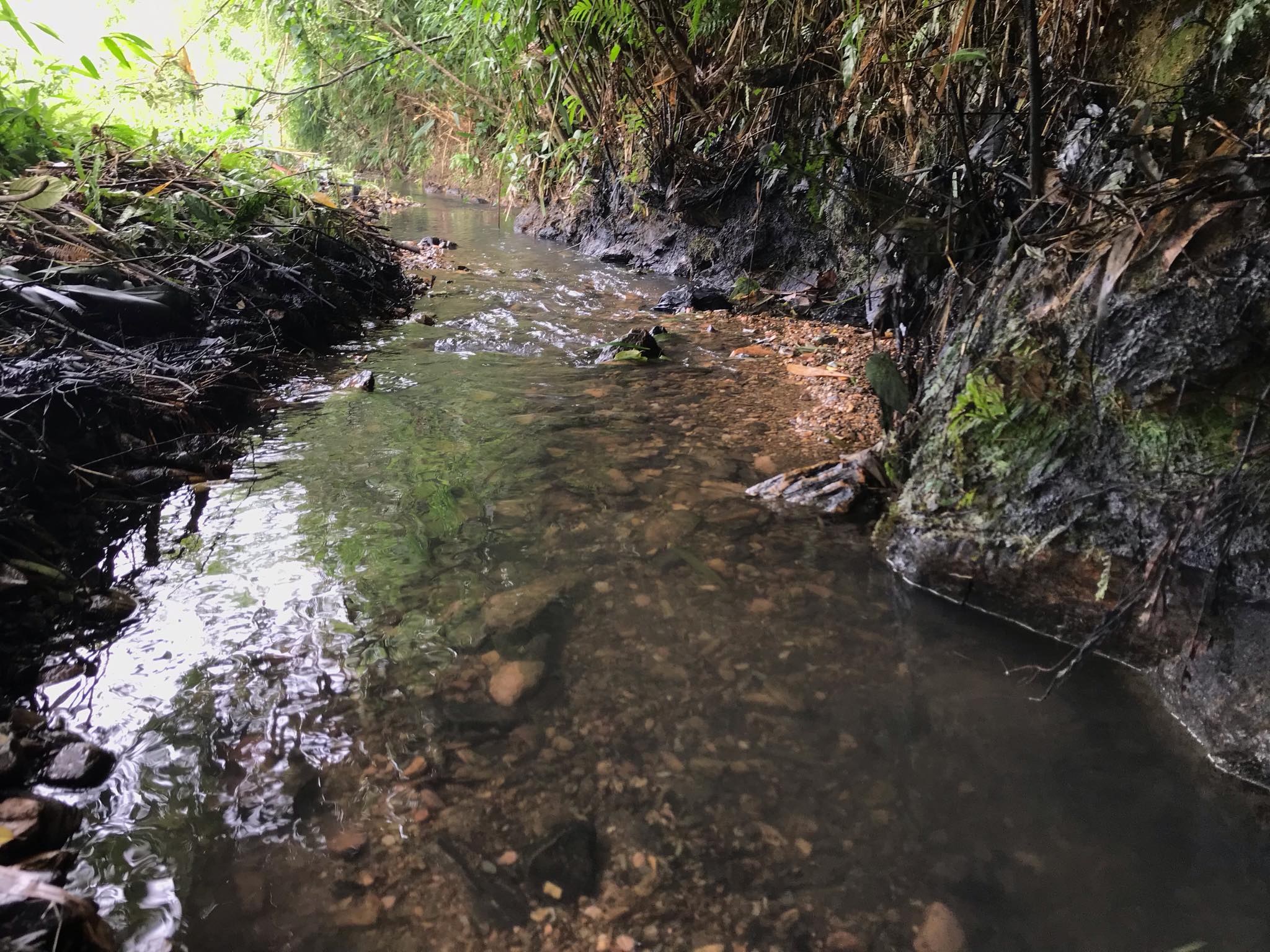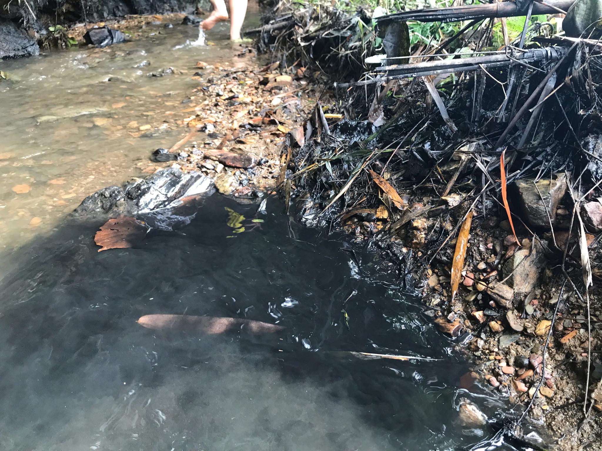 Mưa lớn khiến dầu thải tràn qua đường vào ao cá nhà dân rồi xuống suối vào hồ chính của nhà máy