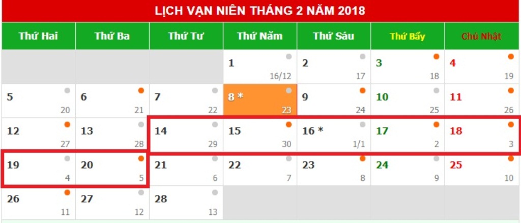 Phương án 2: Nghỉ 1 ngày trước Tết, 4 ngày sau Tết. Nghỉ 7 ngày liên tục từ ngày 15-2-2018 đến hết ngày 21-2-2018 Dương Lịch (tức ngày 30 tháng Chạp đến Mùng 6 tháng Giêng năm Mậu Tuất). Trong đó 1 ngày trước Tết, 4 ngày sau Tết, 2 ngày nghỉ bù do ngày Mùng 2 và Mùng 3 Tết trùng với ngày nghỉ hàng tuần.