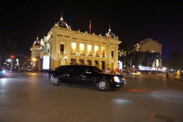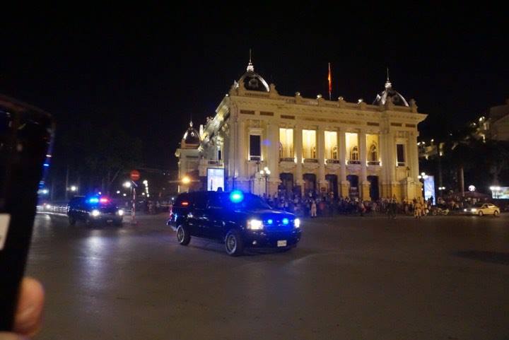 Chiếc xe chở Tổng thống Donald Trump xuất hiện trên đường phố Hà Nội.