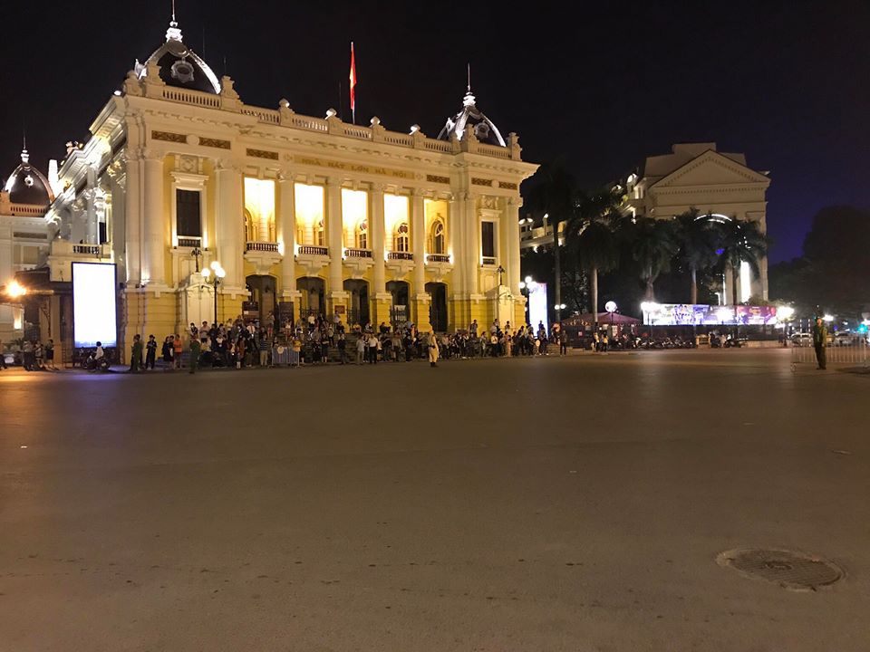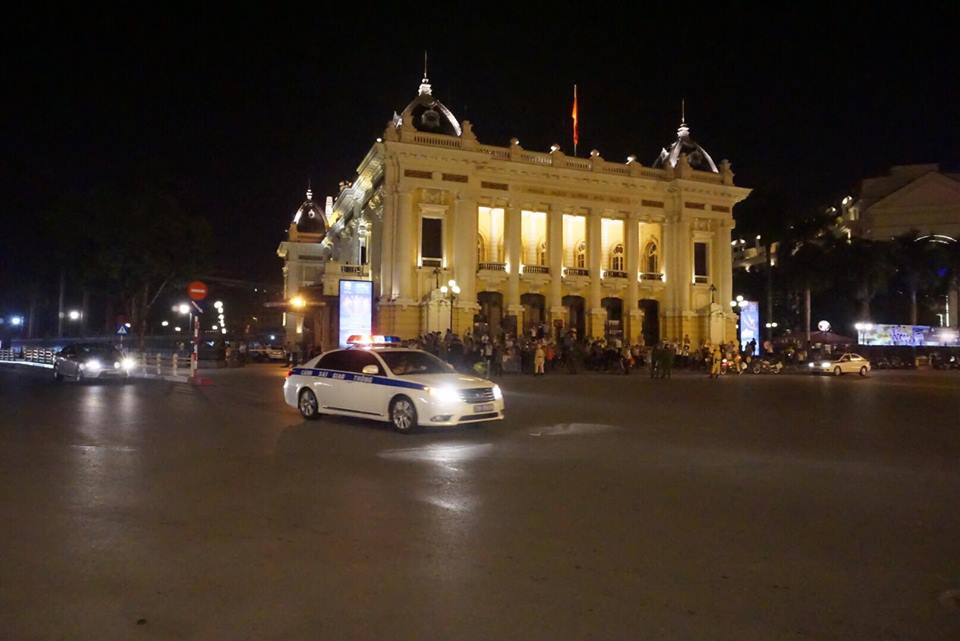 Tại thời điểm này, trên đường phố Hà Nội khu vực khách sạn Metropole - Nhà hát lớn nhiều người dân đứng 2 bên đường để chào đón Tổng thống Trump. An ninh trên các tuyến đường nơi Tổng thống Trump và đoàn xe đi qua được thắt chặt. Lực lượng an ninh căng dây ở ngã tư Tông Đản - Lê Phụng Hiểu.