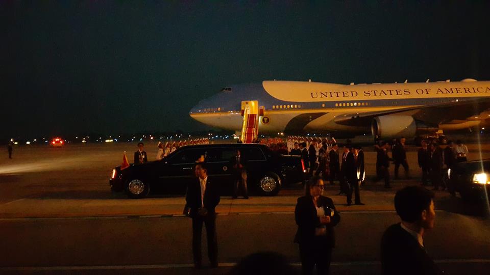 17h hôm nay (11/11), chuyên cơ chở Tổng thống Mỹ Donald Trump đã hạ cánh ở sân bay Nội Bài, bắt đầu thăm chính thức Việt Nam theo lời mời của Chủ tịch nước Trần Đại Quang.