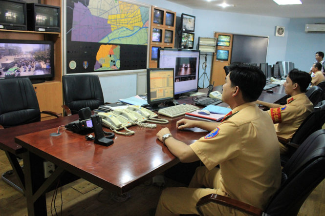 Cảnh sát giao thông theo dõi các phương tiện qua camera. Ảnh: Tuổi trẻ.