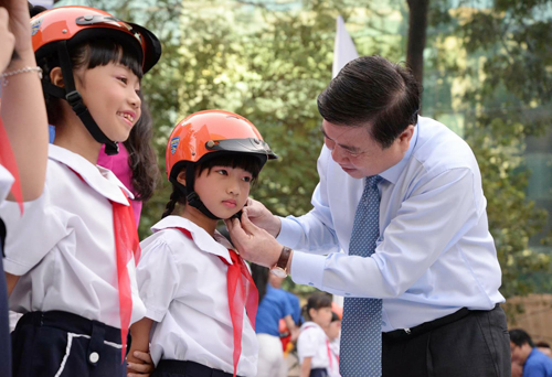 Ông Nguyễn Thành Phong đội mũ bảo hiểm cho các học sinh tại buổi lễ. Ảnh: Hữu Nguyên.