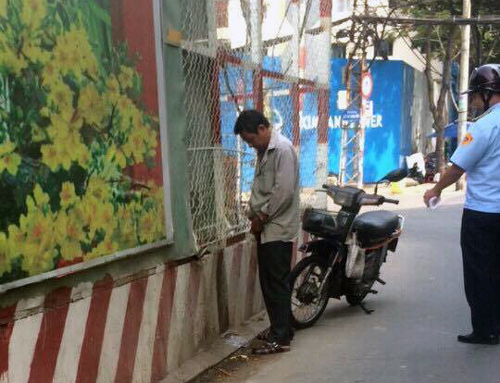 Một người xe ôm bị phát hiện “tè bậy”. Ảnh: Trật tự đô thị.